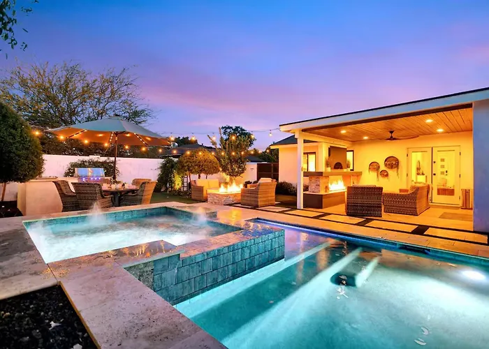 Pool & Spa, Fire Pit, Bbq, Walk To Old Town villa offers self-catering amenities, such as an equipped kitchen, and an outdoor dining area for guests' convenience. There is also an electric kettle, tea and coffee making equipment, and glassware available in the kitchen. Ruze Cake House includes American cuisine, situated just a 12-minute walk away. Main St & Goldwater Blvd bus stop is located 0.2 miles away, allowing you to discover Scottsdale.